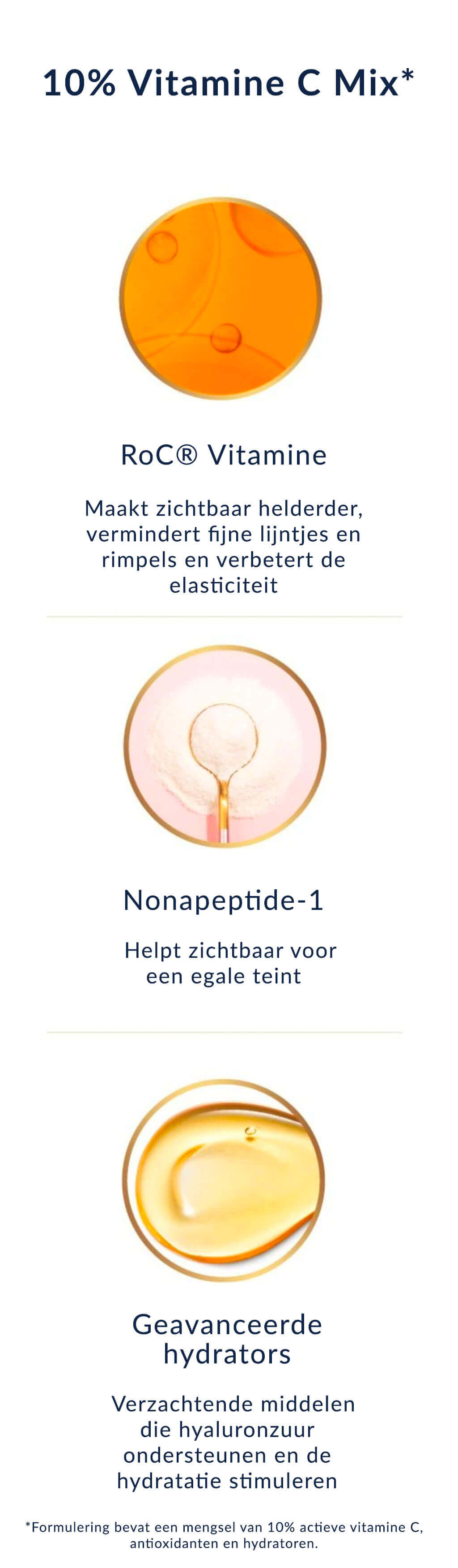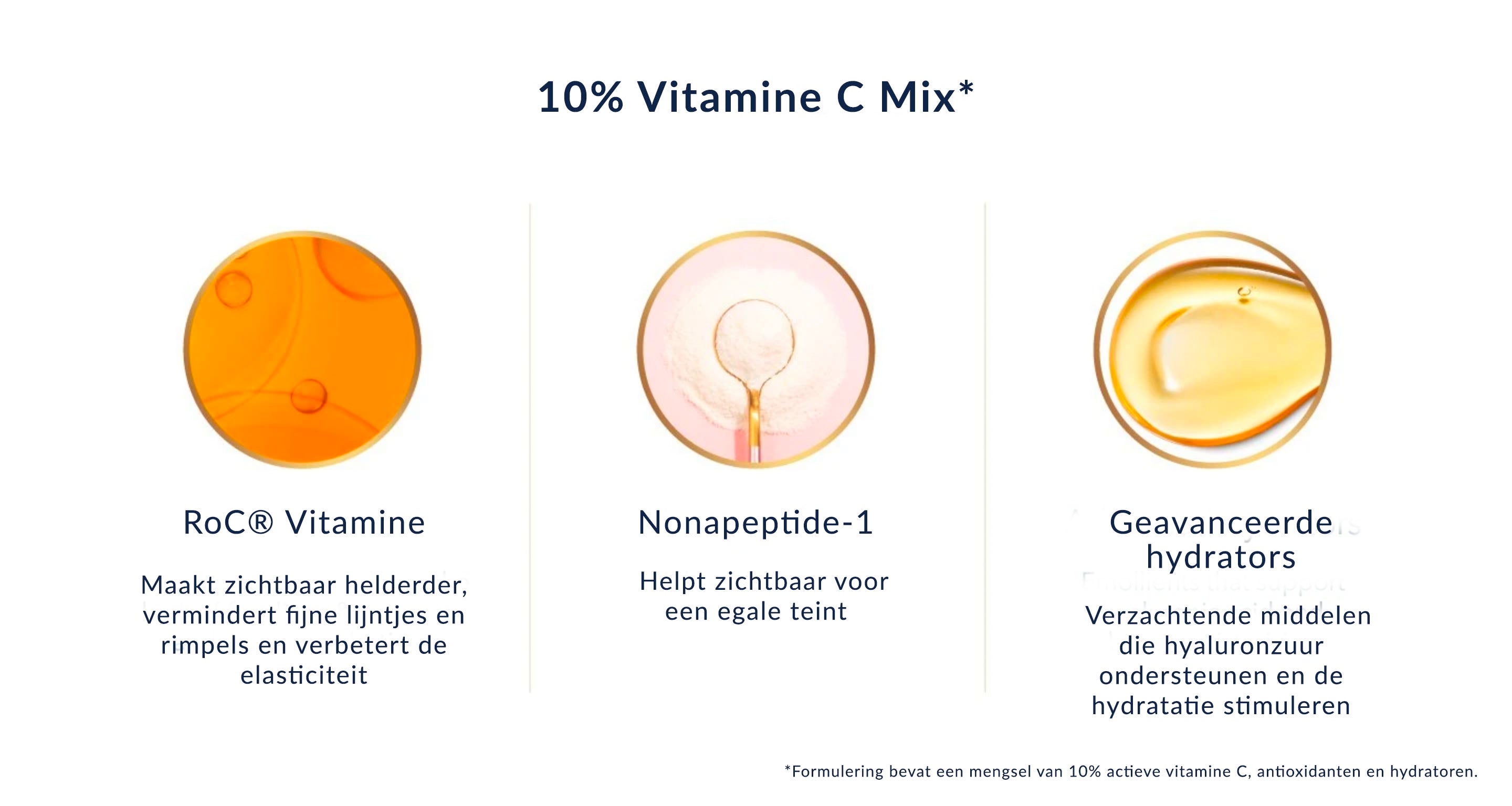 RoC-onderzoek heeft uitgewezen dat vitamine C het meest effectief is in combinatie met andere antioxidanten. Met dit in gedachten heeft RoC een 10% vitamine C-mengsel ontwikkeld dat overloopt van potentie. Deze mix combineert vitamine C in zijn ware vorm, ascorbinezuur, met complementaire antioxidanten voor maximale verheldering en verstrakking van de huid die zich kan verdedigen tegen oxidatieve stressoren.